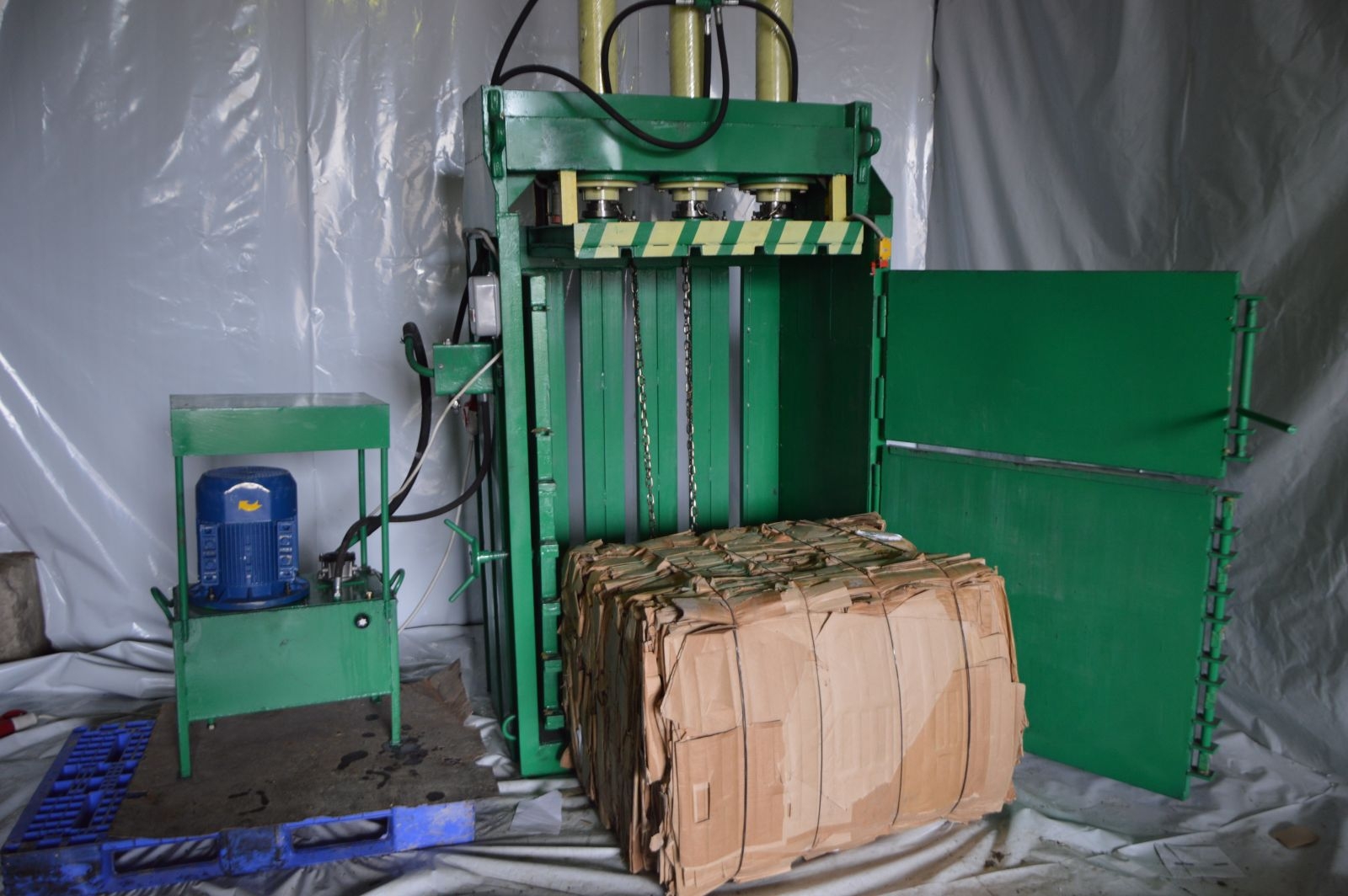 Готовая кипа извлекается из пресса с помощью выталкивающего механизма. Для крупных тюков используется подъемное оборудование (например, телескопические подъемники или транспортные конвейеры), а для мелких брикетов - ручной метод.