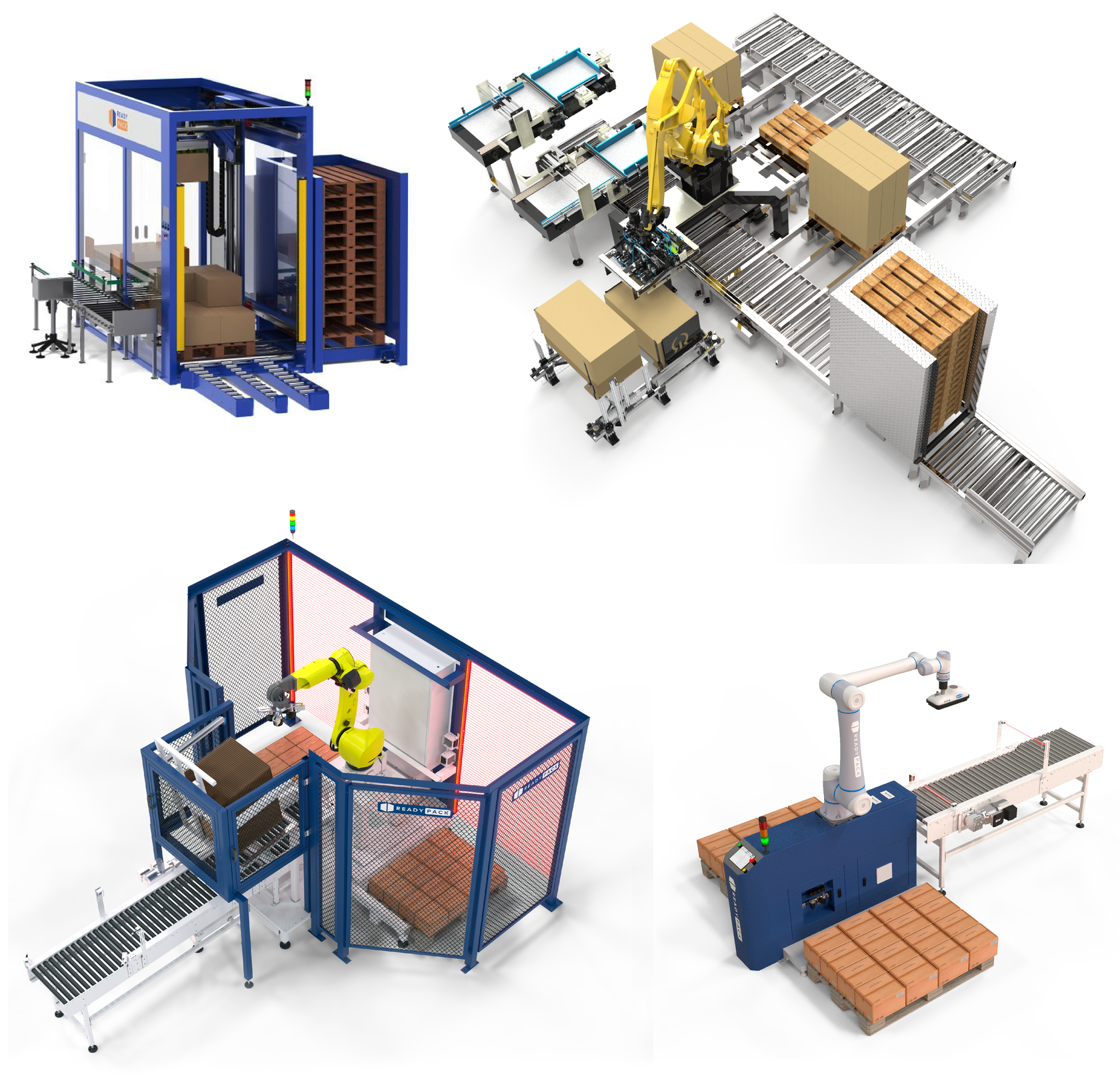 Роботизированные промышленные укладчики паллет — наиболее гибкий тип. Используются 4-осевые или 6-осевые роботы, обеспечивающие перемещение в трехмерном пространстве с радиусом действия до 3 м. Грузоподъемность варьируется от 40 до 240 кг в зависимости от модели, точность позиционирования ±0,02–0,05 мм. Высокая гибкость траекторий позволяет обслуживать несколько конвейерных линий одновременно, формировать сложные схемы укладки и работать с разнородной продукцией.