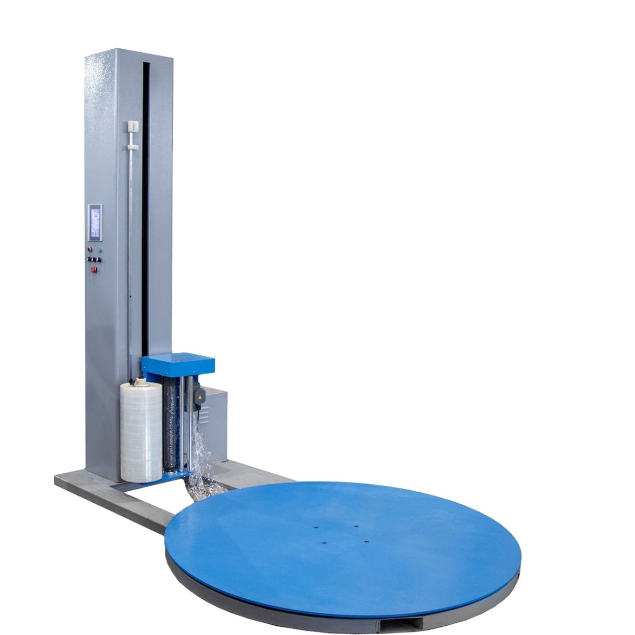 Машины с вращающимся столом являются наиболее распространенным решением. Они перемещаются по цеху только при помощи погрузчика. Груз устанавливается на платформу, которая приводится в движение электродвигателем. Каретка, на которой закреплен рулон с пленкой, остается неподвижной в горизонтальной плоскости и перемещается только вертикально вдоль мачты. Данный тип оборудования требует наличия свободного пространства вокруг платформы для безопасного вращения груза. Зона безопасности должна превышать радиус вращения на один метр и более.